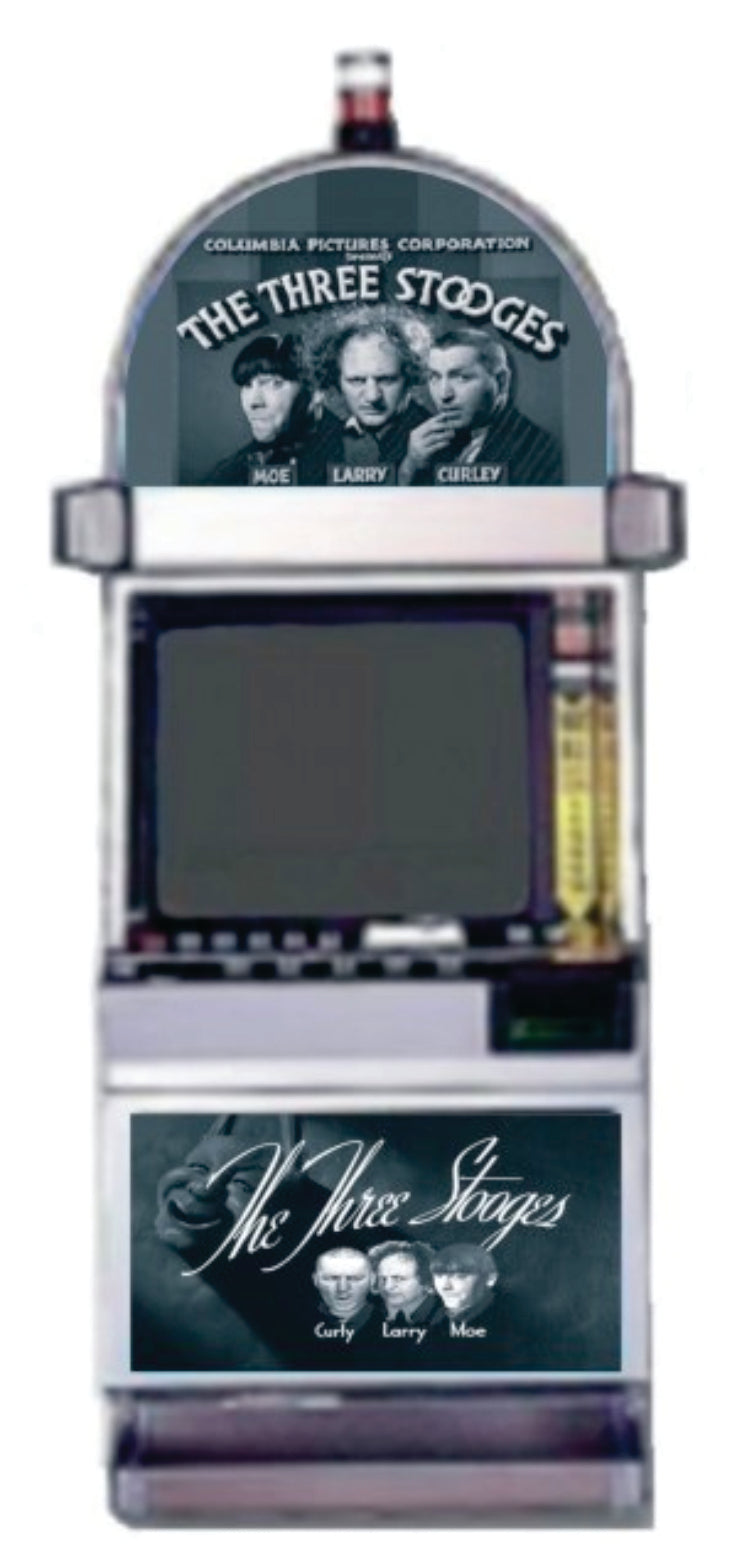 The second bonus is the “In Yer Face Curly Bonus” and this bonus is initiated when three Seltzer bottles are revealed in any position on any three reels. The video screen then changes showing a punching bag. The slot player then touches the punching bag to start the bonus revealing the number of shots awarded to the slot player. The number of shots is a random number from one to ten. The screen changes again showing eight sections of Curly’s Face. Hidden behind each section of Curly’s Face are pay amounts specific to the shot number. With these shots that were awarded, the slot player touches one at a time the sections of Curly’s face. For each shot taken the selection pay value is added to the bonus meter. When all shots have been taken, the value on the bonus meter is awarded to the player and the bonus ends. All pay amounts are multiplied by the total bet on the initiating game when this bonus round was started. This value is then added to the value that the slot player had before the bonus was initiated.