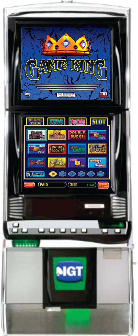 This IGT Game King 8.3 Trimline has 134 games on it in which there are 20 Keno games, 2 Blackjack, 98 Poker games, 12 video slots. This video slot machine has a 19 inch LCD touchscreen monitor.